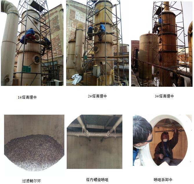 ,喷淋泵也正常运转,可是主任反映在二三车间马路通道经常闻到飘入的酸雾。经过排查、分析、可能是塔内螺旋喷咀堵塞,碱液不能完全喷淋,造成酸雾冒出,于是就抓紧时间对三个塔的喷咀逐个进行清理: