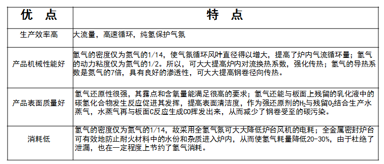 接着我们详细了解下,全氢罩式炉是采用100%的H2作为退火介质,钢卷的径向导热系数较大,提高了钢卷内部的传热速度,减少升温过程中钢卷的内外温差,能获得更好的机械性能;采用全氢退火,钢卷不脱碳、不增碳,带钢表面的润滑液能更容易挥发,能确保带钢表面的光亮程度;由于氢气的比重较小,节约能源。